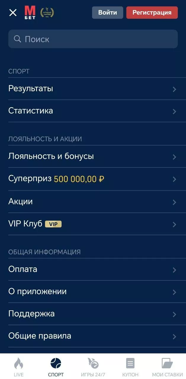 Приложение создано для быстрого доступа к спортивным событиям и статистике. После входа пользователю доступны разделы «Линия», «Live», «Купон», а также личный кабинет. Структура повторяет сайт, но оптимизирована под экран смартфона.